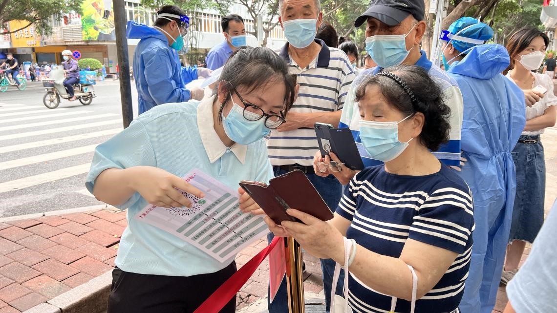 我们可以看到,来进行核酸检测的居民中,有很多年纪较大的老人家。他们大多数不会操作手机录入信息,刘付珊便一遍一遍地帮助他们操作登记,遇到不理解的居民时,刘付珊还会耐心答疑解惑,尽自己的全力帮到每一位老人。