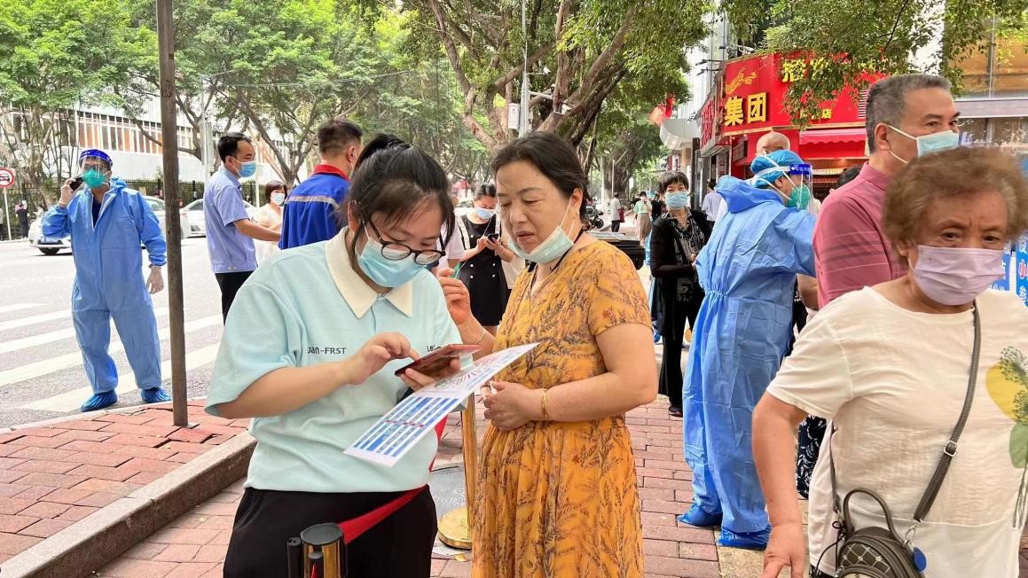 刘付珊在现场引导居民有序排队,时刻提醒居民保持一米安全间距,戴好医用口罩,做好个人防护,耐心细致地引导每一位排队受检的居民填写线上信息,生成预约码,依次核验并有序进入检测通道。