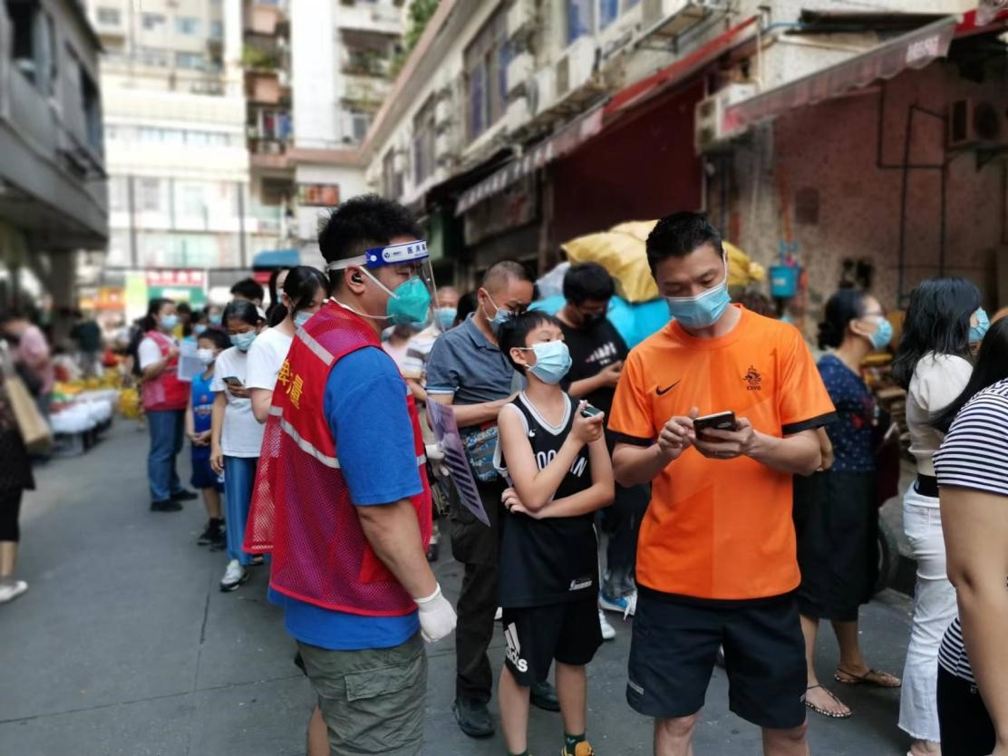 天河区南大社区餐餐鲜核酸采样现场排队人员比较多,工作人员人手比较紧张,在街道公共服务办主任孙主任的协调下,我司职工黄飞龙前来支援,指引居民扫场所码、查验核酸码,维持秩序,缓解了人手紧张问题,使秩序更井然!